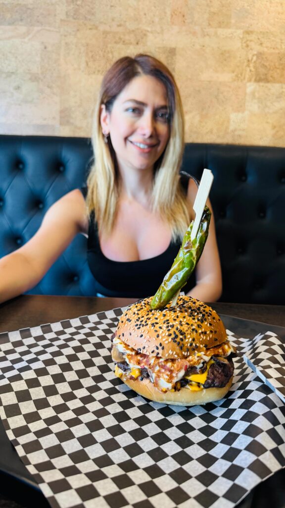 8 oz Beef Patty, Cheddar, Mozzarella, Onion Chips, Baba Ganoush, Parsley, Onion, Special Sauce.